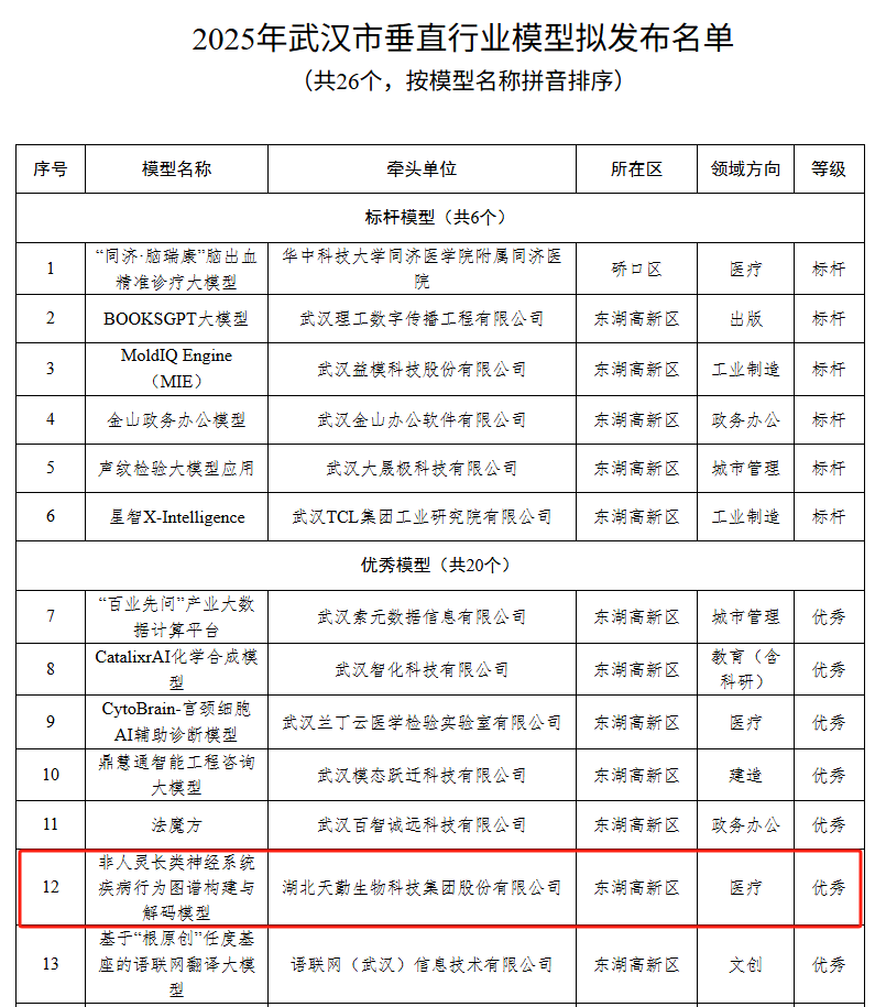 天勤生物行為圖譜解碼模型入選2025武漢市優(yōu)秀垂直模型