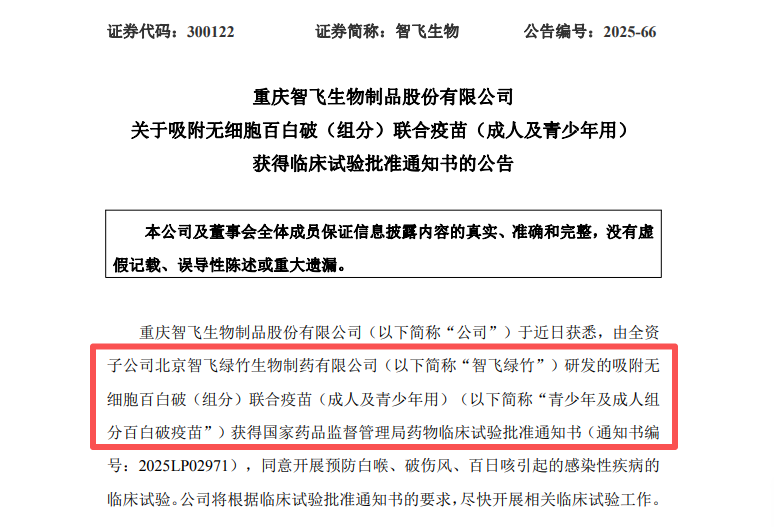 近日,智飛生物全資子公司北京智飛綠竹生物制藥有限公司(以下簡稱“智飛綠竹”)研發的吸附無細胞百白破(組分)聯合疫苗(成人及青少年用)(以下簡稱“青少年及成人組分百白破疫苗”)正式獲得國家藥品監督管理局臨床試驗許可,標志著我國在青少年及成人百白破免疫保護領域邁出關鍵一步。天勤生物武漢分公司為該項目提供了全套毒理學研究服務,以專業能力為疫苗的臨床獲批精準護航。