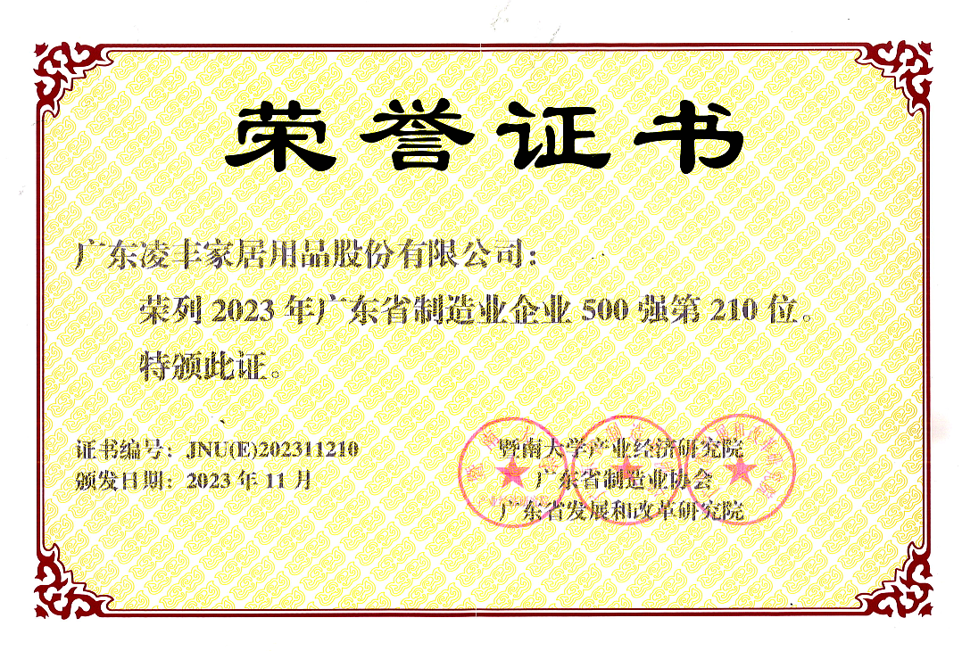 凌豐家品自2020年首次上榜廣東省制造業(yè)企業(yè)500強,本次第三度榮登榜單,也正說明凌豐家品有著扎實的產(chǎn)業(yè)基礎(chǔ)、企業(yè)強大的綜合實力以及行業(yè)影響力,這也是凌豐家品穩(wěn)健發(fā)展的有力見證,是政府、社會和行業(yè)各界對凌豐家品的高度認可。