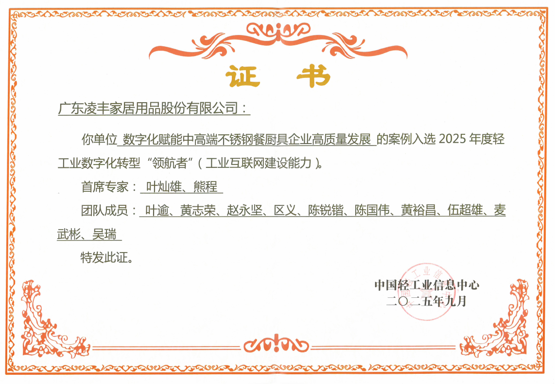 近日,第十五屆中國輕工業信息化大會暨第二屆消費品行業工業互聯網數字化轉型高質量發展大會在北京舉辦。會上,凌豐家品憑借其行業領先的“工業互聯網+先進制造”模式,以“數字化賦能中高端不銹鋼餐廚具企業高質量發展”案例入選2025年度輕工業數字化轉型“領航者”(工業互聯網建設能力),并成為國內餐廚具行業唯一入選該案例名錄的企業。